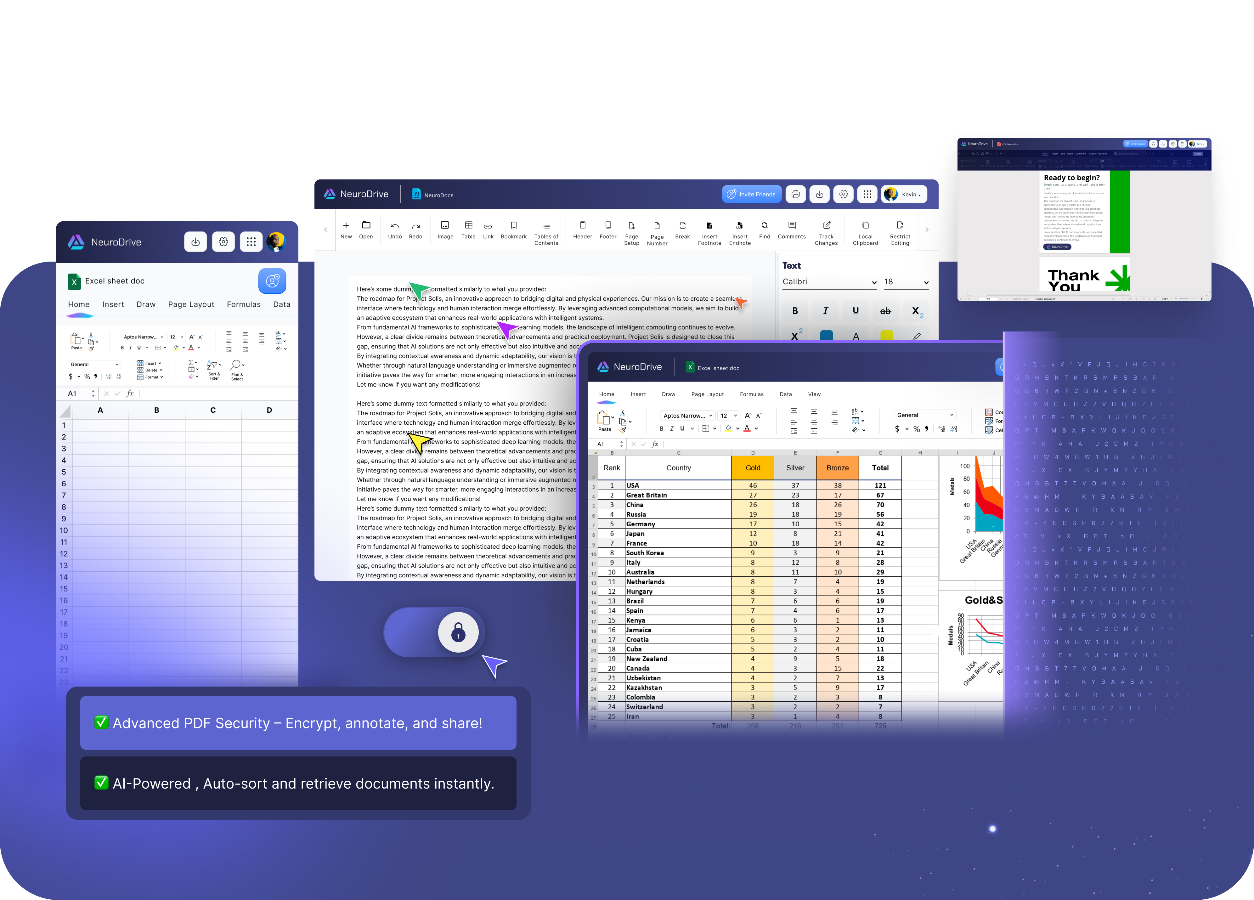 Take control of your workflow with Neuro Drive’s powerful document ecosystem. Whether it’s Neuro Doc for rich text editing, Neuro Sheet for seamless data collaboration, or PDFs for secure sharing, we’ve got you covered. Elevate your productivity with our cloud-based, encrypted, and AI-powered solutions.